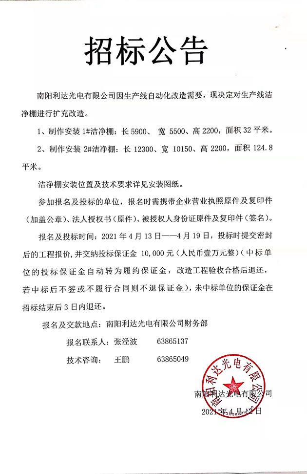 生產(chǎn)線潔凈棚擴充改造招標(biāo)公告